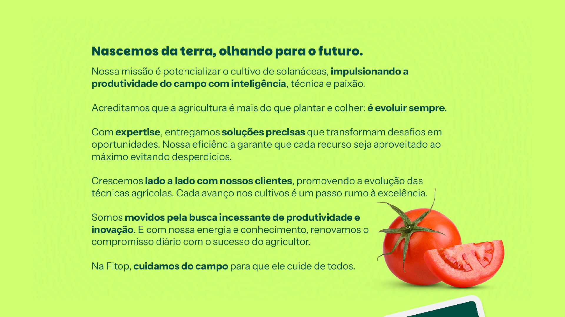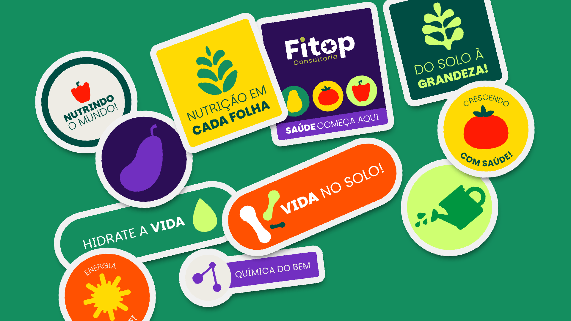 Para traduzir o frescor do campo, criamos uma marca colorida e vibrante, com uma paleta inspirada no universo das solanáceas. Além disso, introduzimos ilustrações que quebram a rigidez técnica, deixando a comunicação mais leve, humana e divertida, sem perder a objetividade que o setor exige.